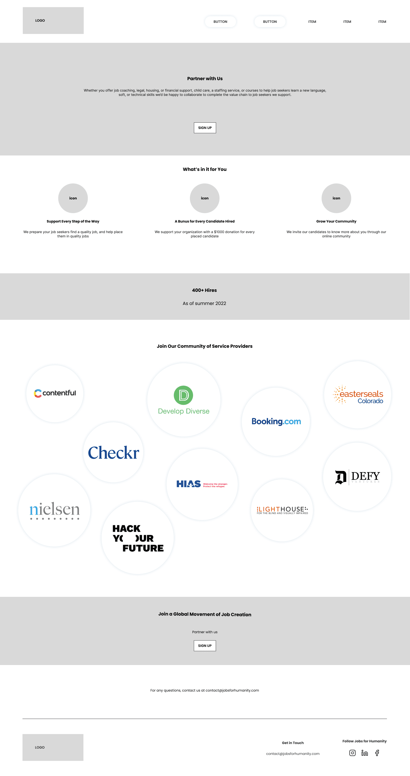 Early wireframes exploring employer, community organization, and job seeker flows—focused on clarity, trust, and reducing friction across distinct user needs. (Job seeker and community organization landing pages shown here).